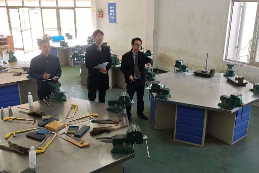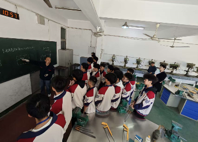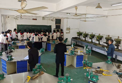 2025年10月28日第四节课,翟善明老师在钳工实训室2502班开设题为《斜面的加工与检测》的公开课。机械教研曹啸虎主任、陈宇航、马海波、吴春华等老师参与听评课活动。