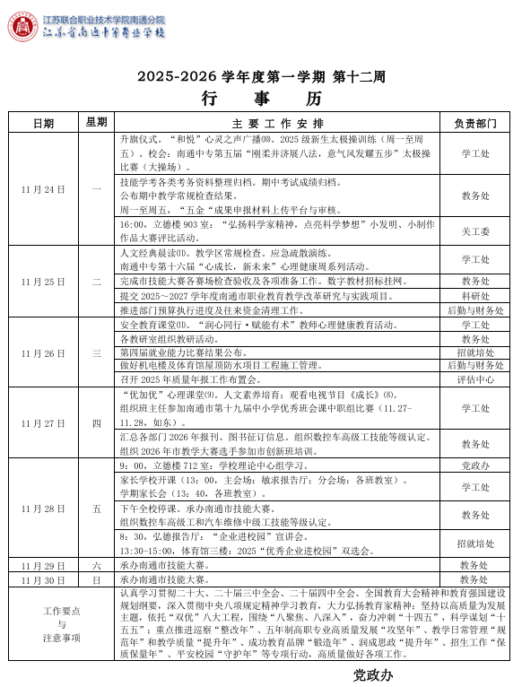 南通中专行事历(第12周)