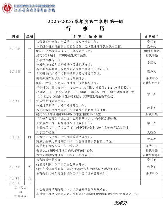 南通中专行事历(第一周)